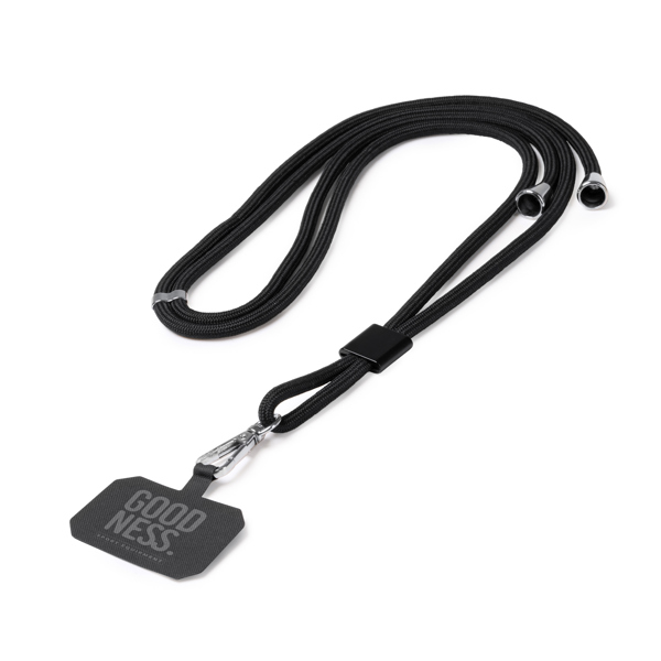 Держатель для мобильного телефона со шнуром из переработанного полиэстера RPET. Регулируемый ремень и карабин.