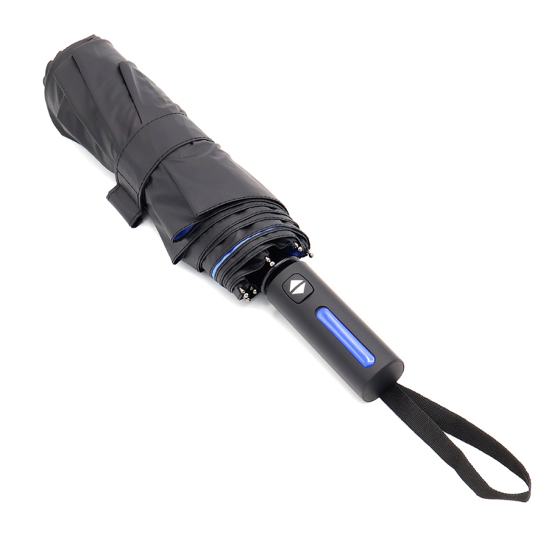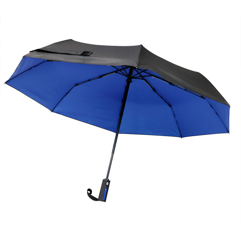 Автоматический противоштормовой складной зонт Sherp. Материал купола – эпонж. На таком материале вода превращается в капельки и скатывается, а сам зонт остается сухим. Цветной элемент на ручке – в тон купола. Ветрозащитная функция – спицы из стекловолокна, а специальное устройство препятствует поломке спиц при резких порывах ветра.