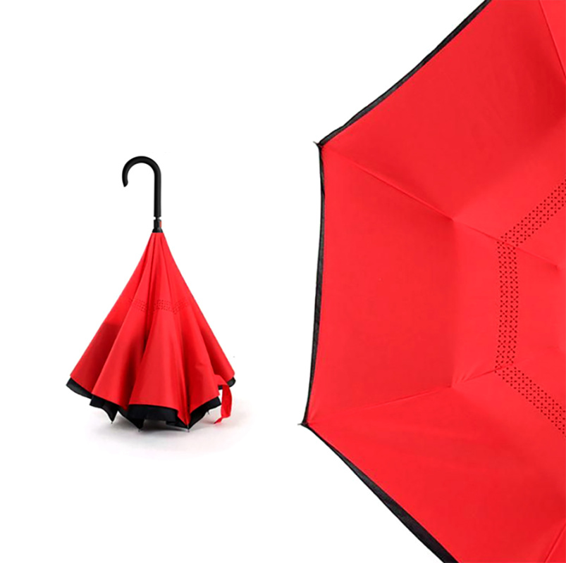 Зонт-трость механический обратного сложения Chaplin выполнен из двухслойной двухцветной ткани эпонж. Спицы - стеклопластик. Металлический каркас. Механический тип: ручное открытие и ручное закрытие. Ручка: черная ручка J с софтач покрытием. Диаметр купола -105 см. Длина - 79 см. Чехол.